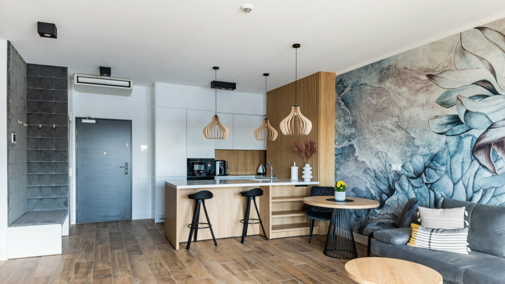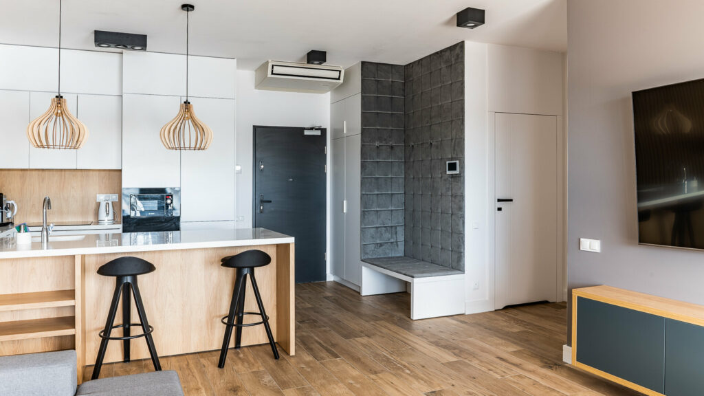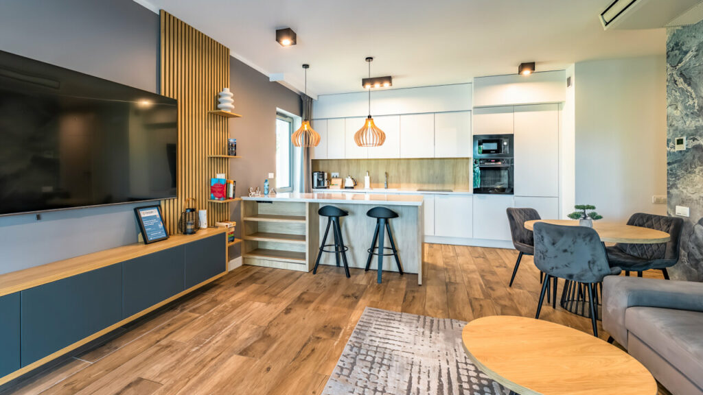 Mazury Residence to realizacja inspirowana naturą, przestrzenią i bliskością wody. Jasne wnętrza, naturalne materiały i duże przeszklenia otwierają dom na krajobraz, tworząc spokojną, harmonijną przestrzeń do życia i wypoczynku. W ramach tej inwestycji wykonaliśmy aż 3 mieszkania, zachowując spójny standard i estetykę w każdym z nich.